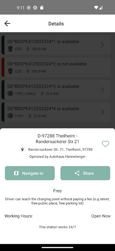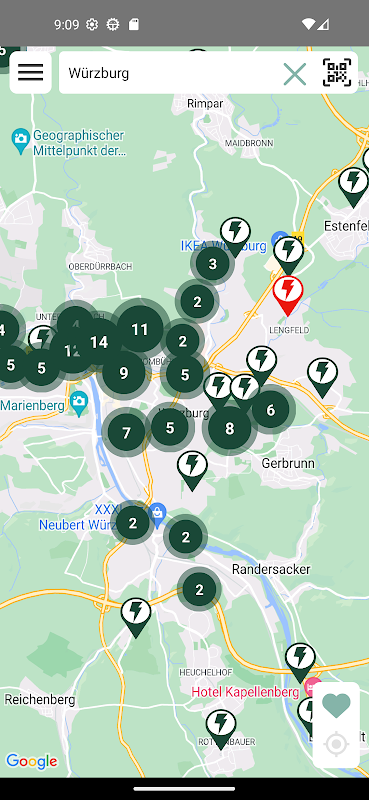 The app offers different ways to identify and use a charging point (map view, list view, short code).