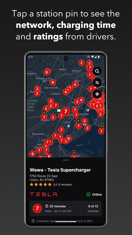 - Chargeway® detects the fastest route and charging station locations for your trip