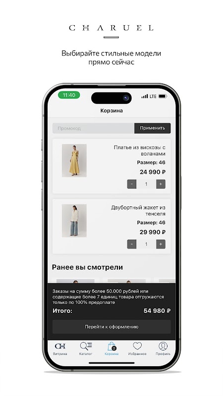 The application catalog has easy navigation, all products are divided into categories. To quickly find products, use filters by size, color and other parameters. We offer our clients already formed capsule collections: for the office, from tweed or denim, and others.