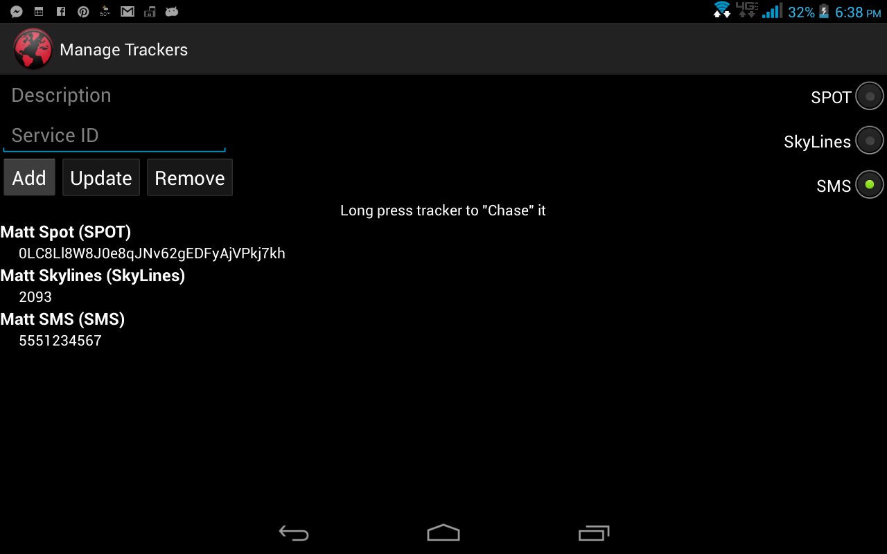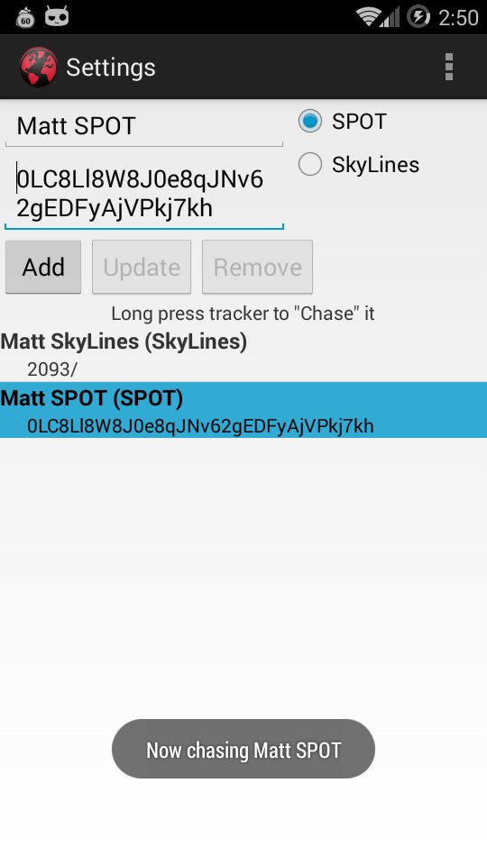 Trying to keep tabs on multiple pilots, all using different devices and services to report their location, and all taking different flight paths? No problem! Just add each device to the list and go! You will see everyone's location, along with your own, all on the same map. Once everyone is in the list, press and hold one to begin chasing them. The overlaying compass will then begin pointing in the direction of the last reported location for that device.