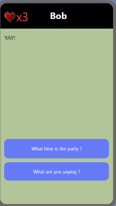The game is about chatting with bob and not make bob offended. In the game, there will be prepared with 2 options of the chat. If you pick the wrong option of chatting, the health(Bob's patience) will decrease. When Bob's patience is lost, Bob will not chat you again. But you still get to turn back time and redo the chat.