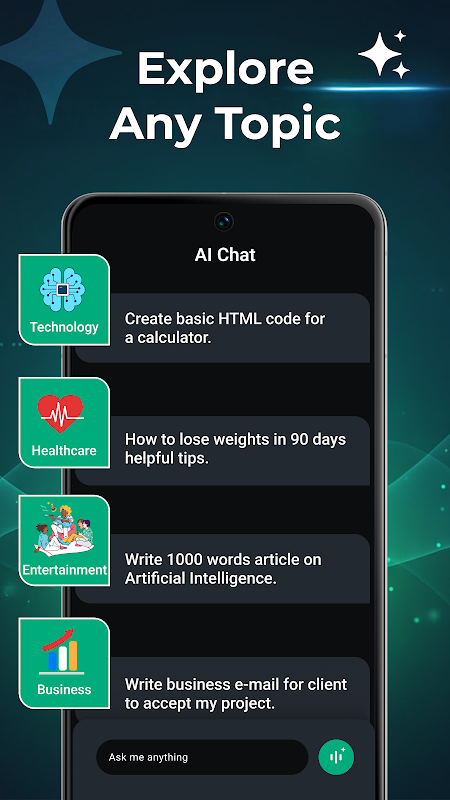 AI Chatbot is an AI-powered application designed to help users generate text, images, and creative ideas for everyday use. It provides general-purpose AI tools for writing, learning, and productivity.