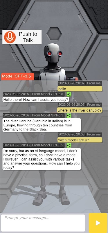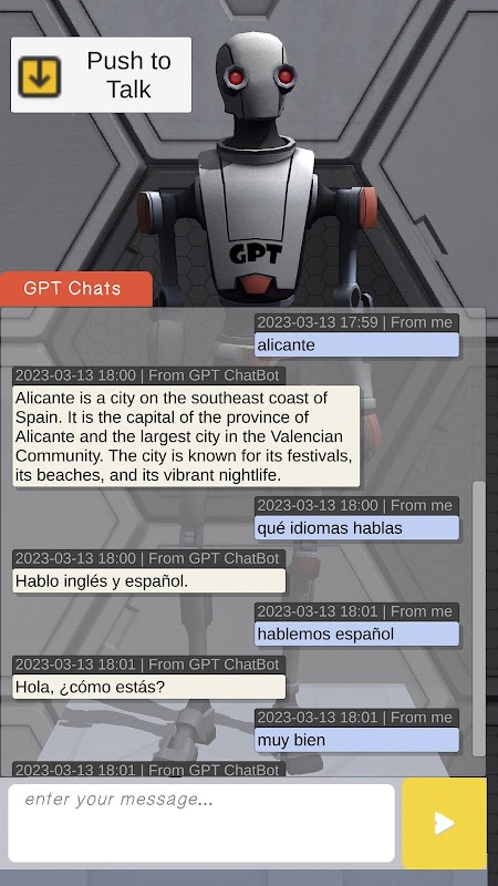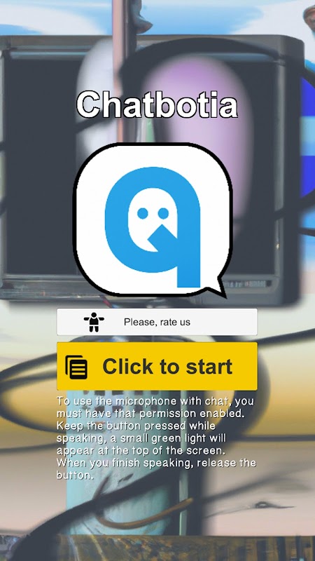 To use this app with the microphone, you must accept the microphone permissions. If this is your first time accepting them, you may need to restart the app. Press the 'Push to talk' button and hold it, start talking as soon as a small red light comes on at the top of the screen and keep the button pressed. Once the phrase is finished, release the button. The chatbot will recognize your text and send you a reply. Enjoy it!