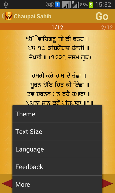 'Chaupai Sahib Hindi' app let you read and listen to paath on your mobile. You can read 'Chaupai Sahib in Hindi' or 'in Punjabi'. Also, you can read meaning of path while reading or listening to 'Chaupai Sahib Path'. Purpose of this app is to let busy and mobile young generation reconnect with Sikhism and Gurubani by reading path on mobile. We hope that you will find this app useful and will use it daily.