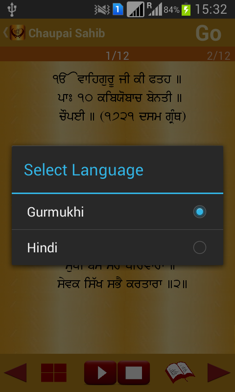 # Select language of your preference:- 'Chaupai Sahib in Hindi' or 'Chaupai Sahib in Punjabi' (Gurmukhi)