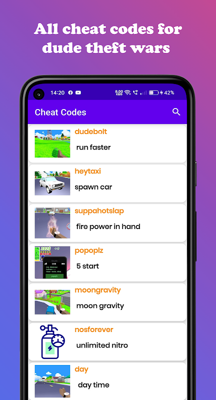 Explore a comprehensive list of cheat codes meticulously curated to give you the upper hand in Dude Theft War. Whether you're looking to unlock powerful weapons, amass endless resources, or simply defy the laws of physics, our app provides you with a treasure trove of cheats to elevate your gameplay to new heights.