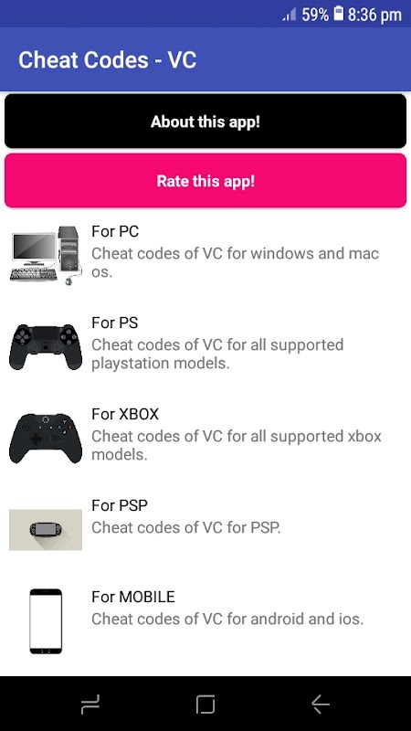 In this app you will find cheat codes for VC and VCS. We included cheats for pc, for ps, for psp and for xbox. Make your gameplay more fun using cheats codes.