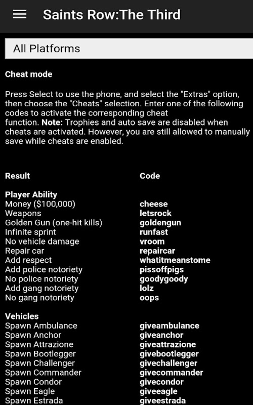 Cheatbook offers you the cheat codes & cheatsheets required to unleash some hidden features of your favourite games and to complete them in an easier way with loads of fun. Its pretty simple to use the app. Pull the drawer from left and select your game from the specified category,scroll down until you find your platform (PC,PS4,PS3,XBox One,XBox 360,Wii).