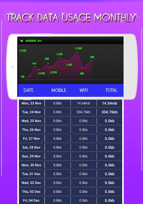 Record Maintenance: Keep record of daily data use of your smartphone on data network and on WIFI along with data use by applications for almost 30 days.