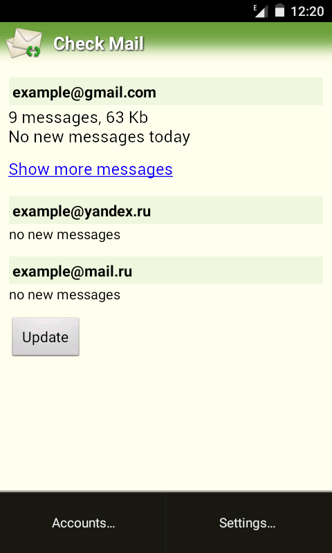 Check Mail is a small and fast application to check mail before downloading. It works with any POP3 servers. Checking email is available for multiple accounts. Users can use anti-spam feature by marking messages for deletion and deleting them directly in mail boxes without downloading.
