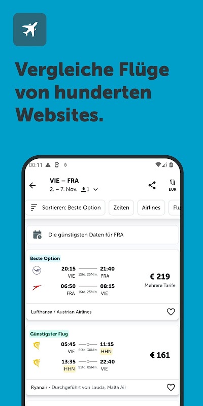 • Filter search results by stopovers, airlines, departure times, amenities and more. • Find the right time to book. Thanks to the price prediction you will know if flight prices change. The price forecast shows you the flight price changes over the last 90 days.