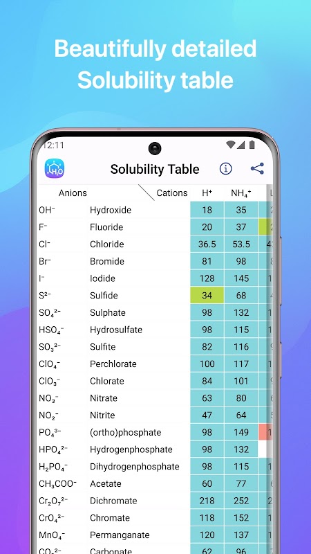 👋 In addition to the equation solver, the app also comes with a few handy tables and charts, including a solubility table, a chart of electronegativities of the elements, and a reactivity series of metals. Plus, all of the tables and charts including the Periodic Table of elements are interactive, so you can zoom in using pinch gesture for a closer look or zoom out to see the entire table.