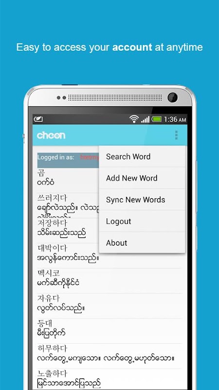 Cheon Dict(dictionary) application is a Korean <-> Myanmar offline dictionary. This application includes with the feature which users can search in both Korean and Myanmar language. Choeon Dict has currently more than 12,000 offline definitions and new definitions are available for registered users to update.