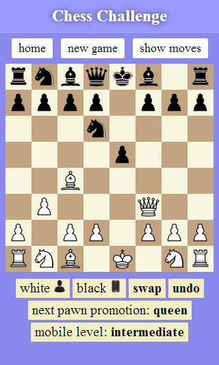 If the game is too easy or hard, you can change the level of the mobile using the 'mobile level' button. Five levels are available. To have a more challenging chess game, tune the mobile to the level higher than yours.