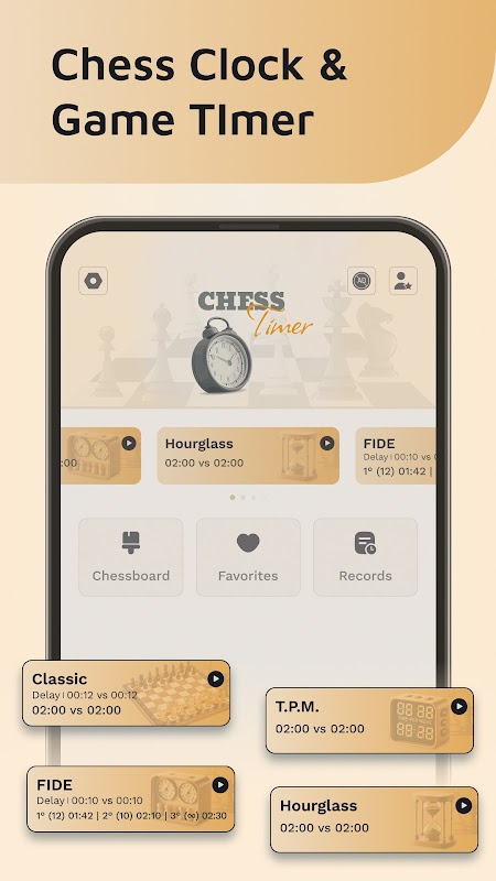• Switch easily between Classic, FIDE, TPM, and Hourglass timers.