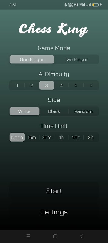 Side Selection: Choose to play as White, Black, or let the app randomly assign you a side.