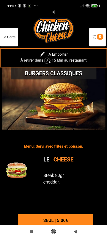 L'application android Chicken Cheese vous permet de commander en ligne ou par téléphone via votre application. Vous pouvez consulter notre carte et choisir vos produits.