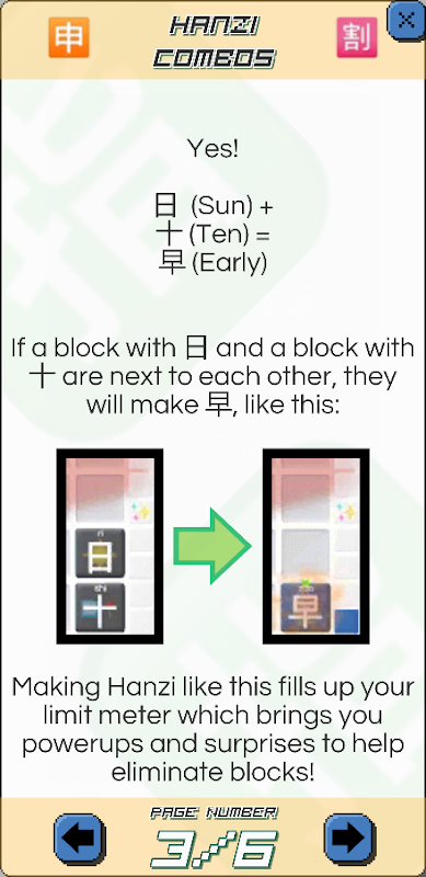 Learn Chinese hanzi by dropping blocks to make hanzi and words! Make hanzi from their parts and words from other hanzi! Blow them up by making words or filling your limit meter and they all EXPLODE!