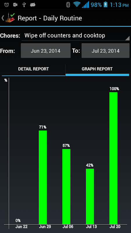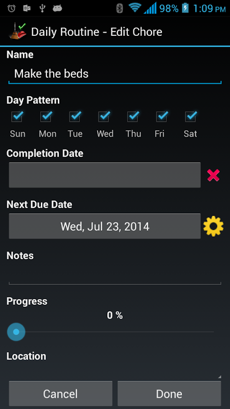 It comes with a pre-loaded check list which has routines, such as "Daily Routine", "Weekly Routine", "Monthly Routine" and etc. You can edit them or add new routine/chores. You can set start/end date, reminder, progress, and notes for each chore.