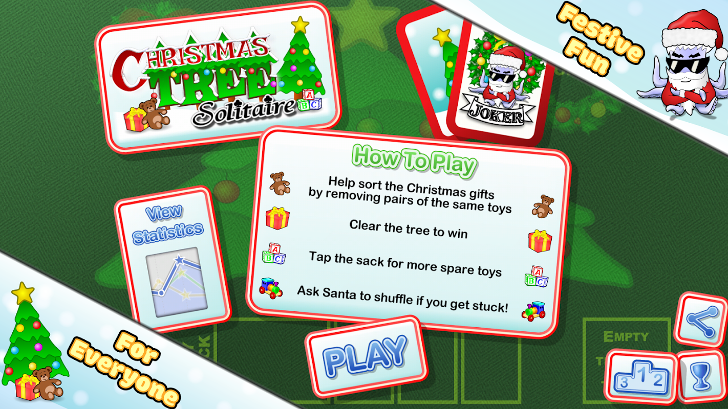 Get off to a festive start this holiday season by helping Santa sort out the presents in Christmas Tree Solitaire! Simply remove pairs of toys to empty the Christmas tree and win the round. Don't worry if you get stuck, Santa is on call to give you a helping hand!