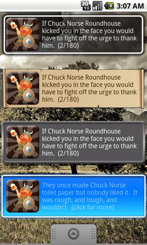 Customize your widget to fit your own style and share with friends by text message, email, facebook, and twitter. Download the Chuck Norse Facts Widget today and let the laughter begin.
