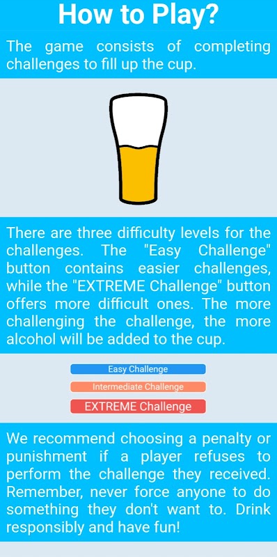 We recommend choosing a penalty or punishment if a player refuses to perform the challenge they received. Remember, never force anyone to do something they don\'t want to. Drink responsibly and have fun!