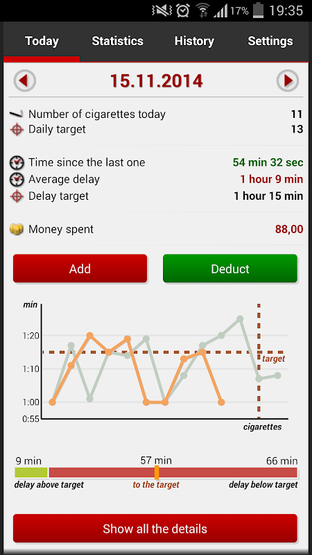 Do you want to reduce the number of cigarettes? Or quit smoking completely? Or just track the amount of cigarettes during the day? Or the costs of your passion? Then this application will be big help for you.