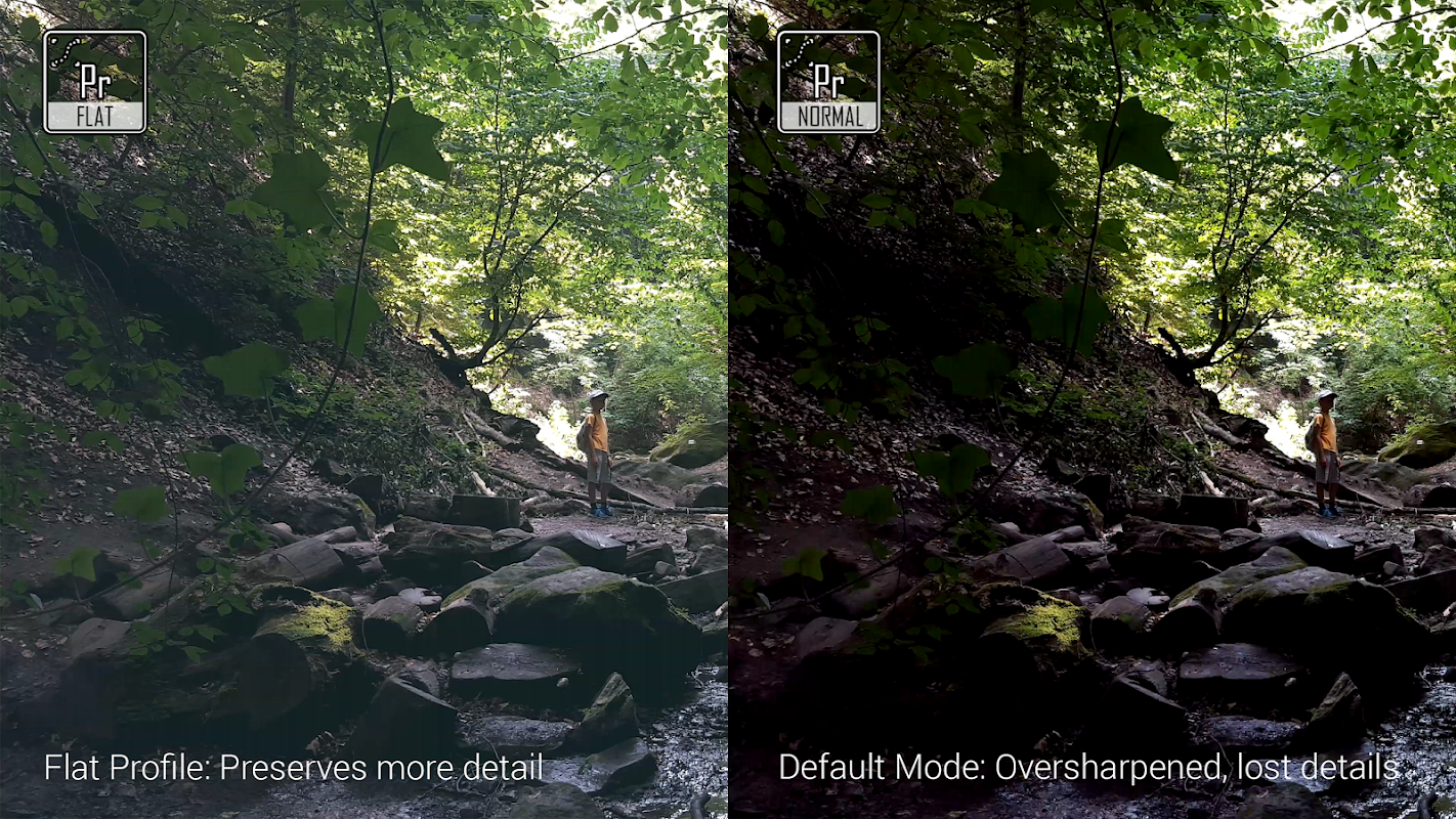 Cinema 4K is the first and only app which introduces Flat Profile (like Cinelike D, S-Log2, V-Log L or ProTune) to get more dynamic range of your videos for post production. In Flat Profile Mode the app disables the default sharpening effect to keep as many details as possible. The raw video might seem flat and dull at first sight, but this is the ideal footage for post processing and color grading.
