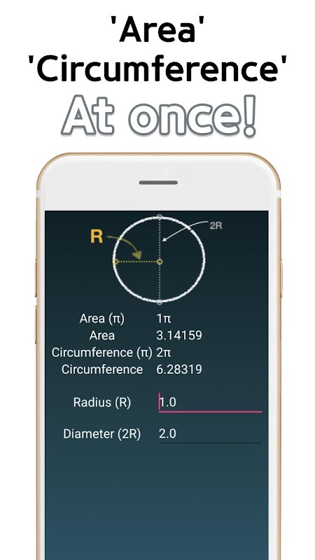 Once you enter a prefered number on a radius section or a diameter section, this app automatically calculates both circle area and circle circumference at once.