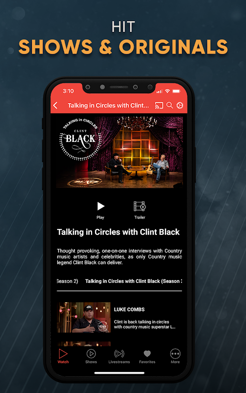 • Talking in Circles with Clint Black - Thought-provoking one-on-one interviews with country music artists and celebrities, as only country music legend Clint Black can deliver.