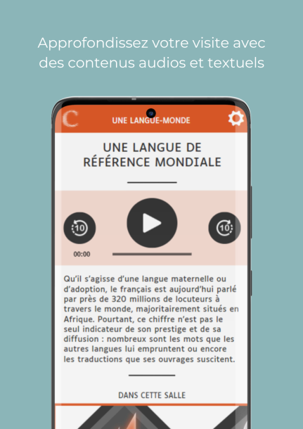 1- Access audio and text content on your phone in 8 languages (English, French, German, Dutch, Spanish, Italian, Chinese, Arabic) or in French sign language, audio description and audio amplification