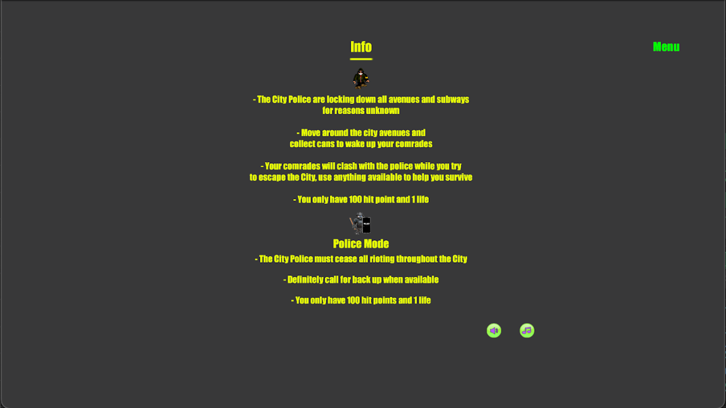 - You must escape from the City with only 100 hit points and 1 life. Wake your comrades by collecting cans - they will clash with the police, buying you time to escape.