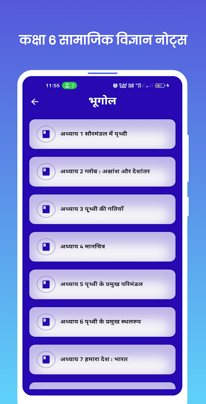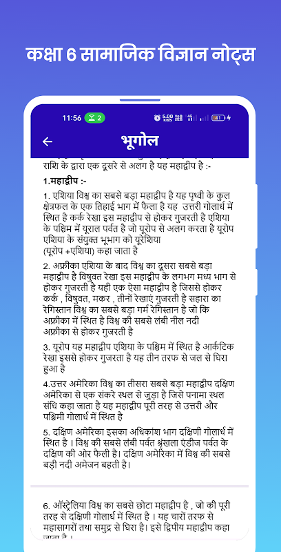 This application contains class 6 social science notes hindi chapter wise with brief description . This application is design for class 7th student each chapter contain detail solution with chapter wise. This application contain 3 sections. Each chapter deal with must to know point. I think this app is must have app for class 6 student.