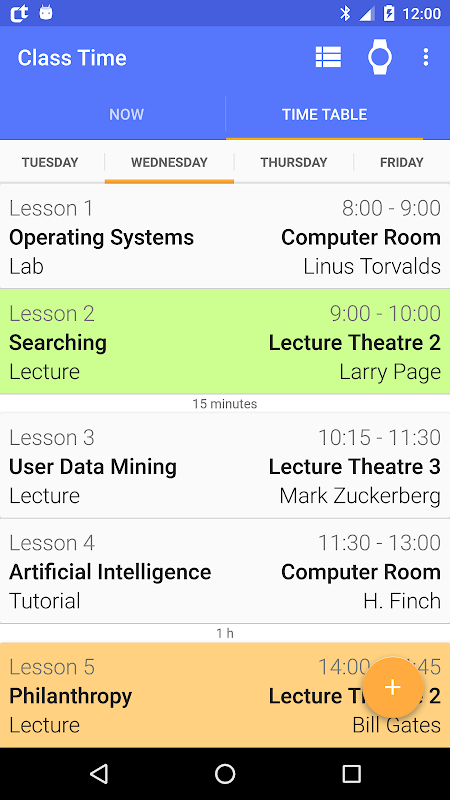 The Time Table tab shows the weekly schedule for each day with every detail on classes.