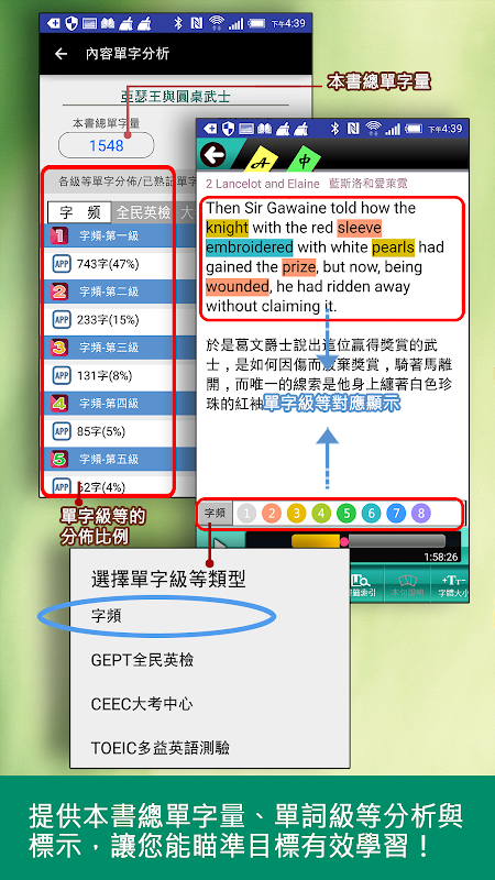 4. 全文英/中英對照:可設定全英文或中英對照學習環境,讓您能搭配閱讀,充分了解文意。