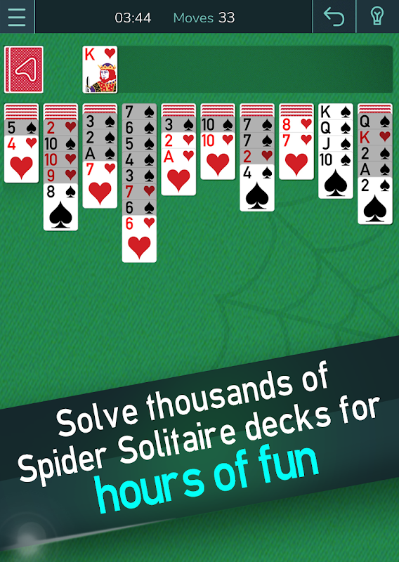 Customize this Spider Solitaire game to YOUR liking. Play the only game with horizontal piles, a large deck of cards, different layouts, challenges and MORE ! Choose from four, two or one suit Spider Solitaire to meet your solitaire needs anytime, anywhere.