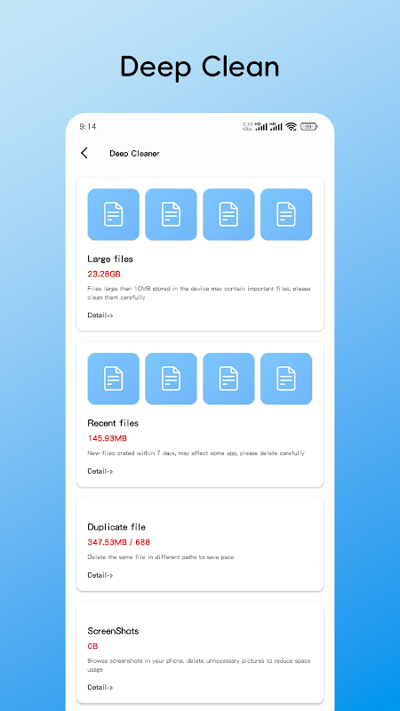 Deep cleaning: Identify duplicate files, large files, new files, screenshots, and manage them easily