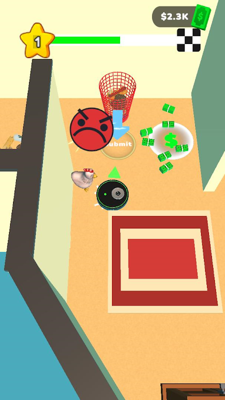 Each level presents a unique room with scattered objects, dirt, and obstacles. Players must control Roomba's movement, collecting dust while navigating around furniture and toys. Puzzle-solving is key as players strategically bridge gaps hindering Roomba's progress.