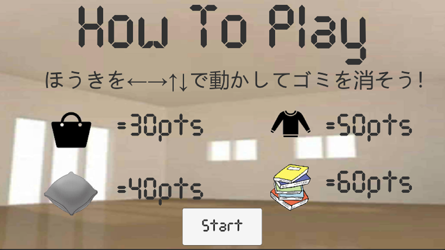 ほうきを矢印キーを押し、移動させて部屋から出てくるゴミに当ててゴミを消しましょう!