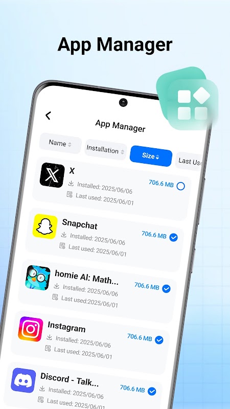 Check app size usage and installed time.