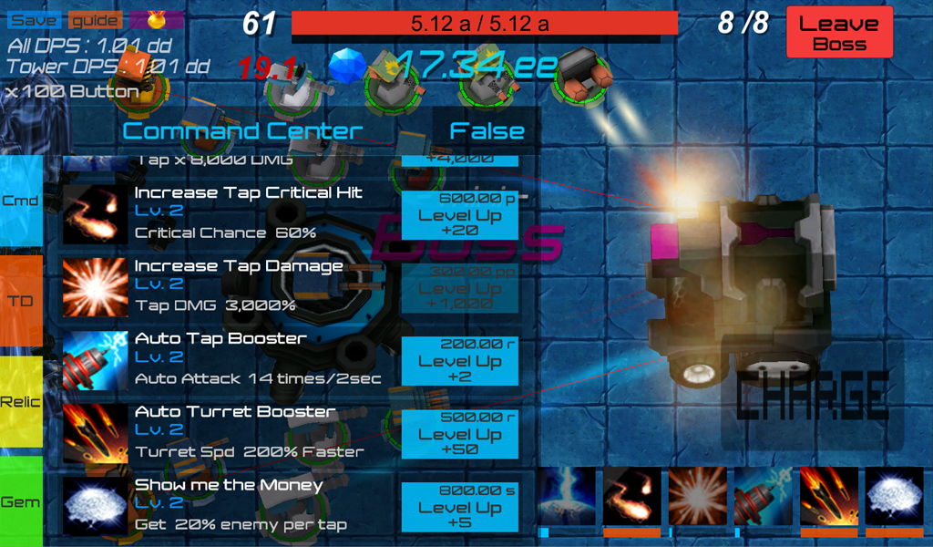 3. 6 types of attack skills: Sniper shot, damage increase, critical increase, tap booster, turret booster, show me the Money.