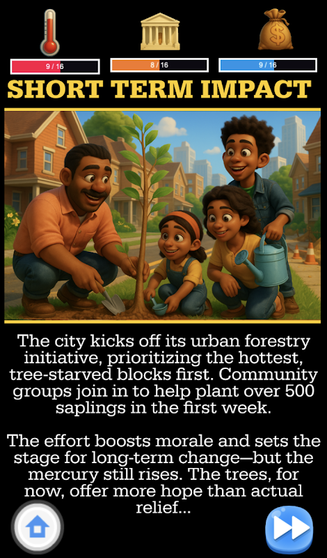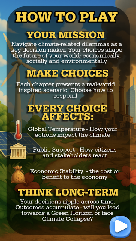 Climate Crossroads is a dynamic, narrative-driven choice game that plunges you into the heart of the climate crisis. As the newly elected sustainability officer of a growing city, every decision you make shapes the fate of your community—and the planet. Will you prioritize rapid innovation, economic growth, environmental justice, or community resilience? The clock is ticking, and every crossroad demands tough trade-offs.