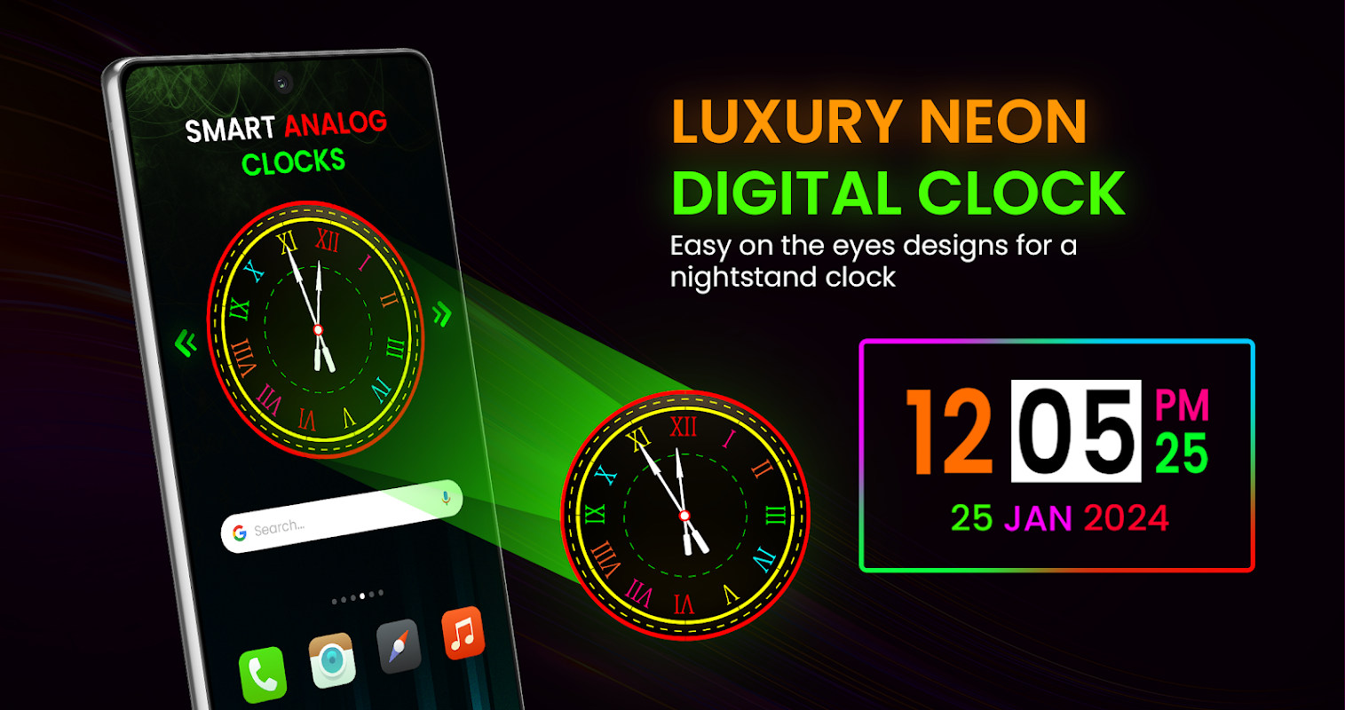 Choose from various clock types like neon, multicolor, classic, and ladies styles. Customize your experience by changing backgrounds, colors, needles, size, and clock position. Whether you want a sleek black wallpaper, a glowing nightstand clock, or stylish live wallpaper free options, this digital clock app has it all.