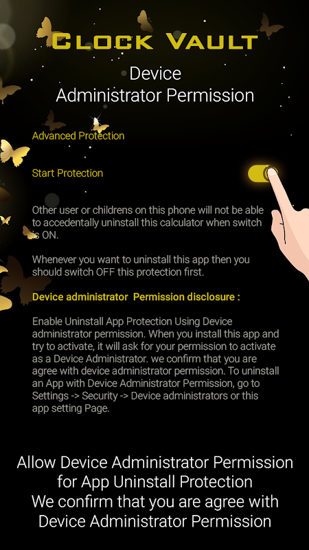 Clock Vault photo locker and video locker needs Device Administrator Permission to prevent it from being uninstalled by intruders and this app never use this permission except for uninstall prevention. Enable this permission from Settings.