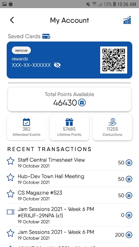When attending a company event the employee uses the the Cloudstaff Rewards app to scan the event bar-code and receive points. The app also allows the employee to monitor their points and see what events are coming up where they could participate and earn more points.