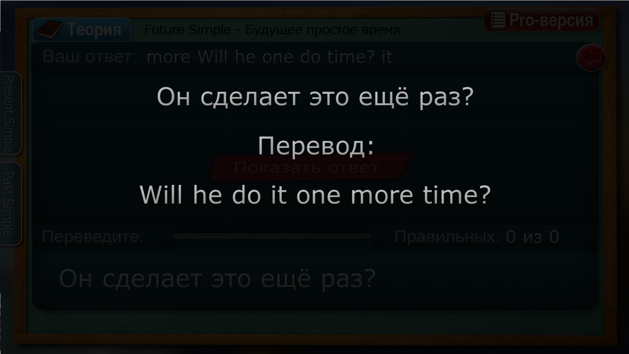 Данная программа представляет собой тренажёр английского языка для обучения составлению предложений в будущем времени. Репетитор и учитель английского языка всегда с вами в вашем кармане. Открывайте его когда вам удобно. Это незаменимая практика языка.