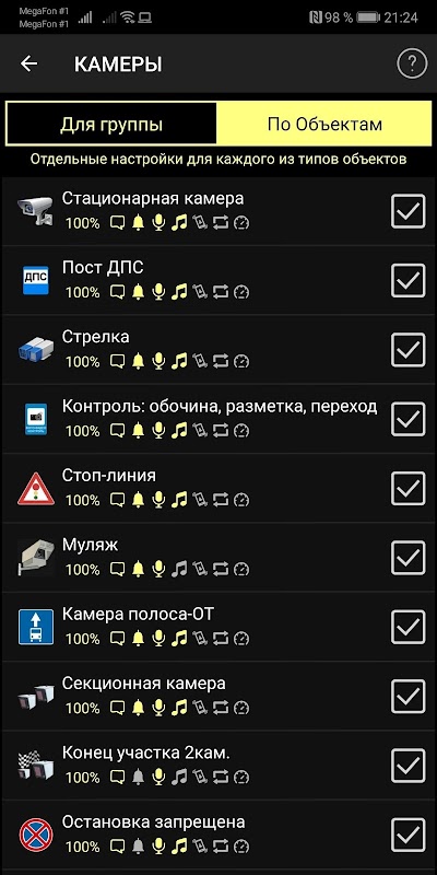 - Для каждой камеры или объекта возможна отдельная настройка звука, голосовой фразы, бипера, превышения скорости и т.п.