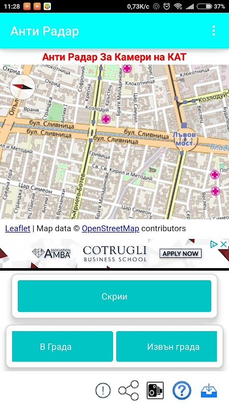 Приложението може да работи и без карта (ако искате да спестите трафик) ще получавате своите известия за наближаване на камера на КАТ. Приложението ползва фиксирани позиции за стоянките на камерите на КАТ, така че можете да имате известяване дори за новите лазерни камери на КАТ.