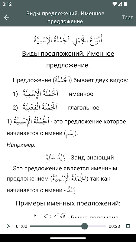 该应用程序旨在帮助初学者学习阿拉伯语语法。在应用程序的初始页面上有一个课程主题列表;在课程名称之前的每一行中,测试结果以百分比形式显示在圆圈中。屏幕左上角有一个按钮 - 三行用于输入设置。学习课程分为39课,每课学习一个主题,通常在课程开始时给出一条规则,然后使用示例详细分析该规则。所有课程均有语音。每节课都有一个测试来测试所涵盖的材料。
