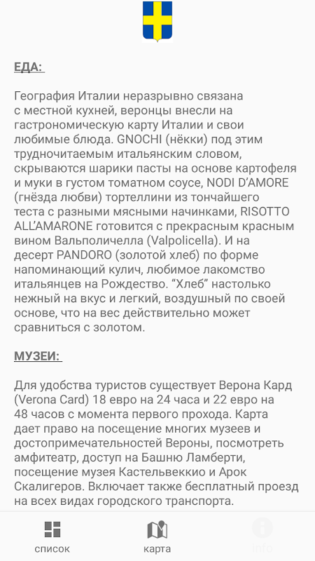 Путеводитель по Вероне в ТЕСТовом режиме. Простой и удобный в использовании. Идеален на один день в городе. Содержит 22 точки маршрута в центре города. Продолжительность прогулки около двух часов. Приложение содержит оффлайн карту с поддержкой GPS. Все отмеченные достопримечательности (точки на карте) имеют звуковое и текстовое описание, а также сопровождаются фотографиями.
